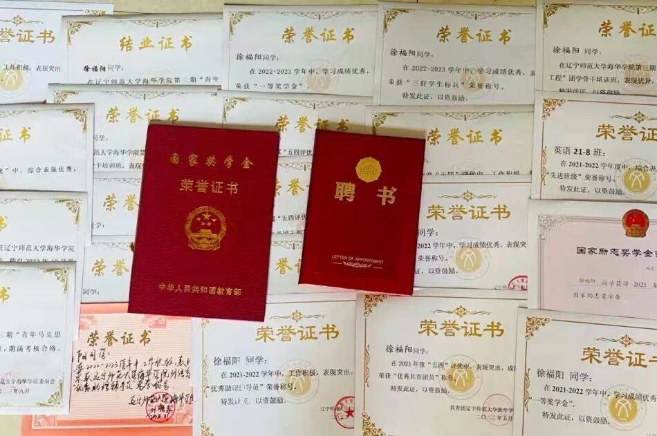 徐福阳同学在校期间积极参与社会实践和志愿服务活动,活动累计10余项。在疫情防控期间,他主动投身于校园防控中,协助医护人员参与核酸检测、防疫值班等工作。在外国语学院老师的带领下,他前往蓉花山镇中心小学开展“爱心陪伴,志愿同行”志愿服务活动,并被“庄河融媒”“魅力蓉花山”官方媒体平台进行报道。此外,他带领“风华红韵,党史传承”实践团参加2023年暑期“三下乡”社会实践活动,并荣获校级“一等奖”。