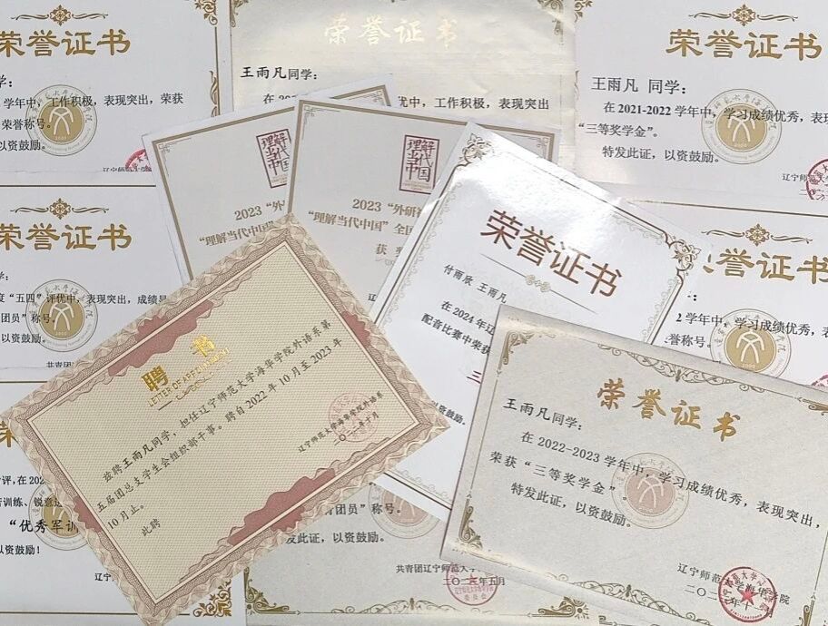 王雨凡同学在校期间努力做好同学和老师之间沟通的桥梁。她本着“锻炼自我,服务大家”的宗旨,在各方面严格要求自己,在工作中虚心向别人学习,积极配合其他班级委员工作,做到真正地服务同学。与此同时,她也积极参加各项活动,曾在2021-2022学年获得校级“优秀共青团员”“优秀军训标兵”“优秀学生干部”“三等奖学金”“三好学生”。2022-2023学年获得校级“优秀共青团员”“优秀学生干部”“三等奖学金”“三好学生”。2023-2024学年获得校级“优秀共青团干部”“优秀学生干部”“三好学生标兵”“三等奖学金”、外研社“国才杯”阅读大赛三等奖、外研社“国才杯”演讲大赛三等奖等30余项荣誉。