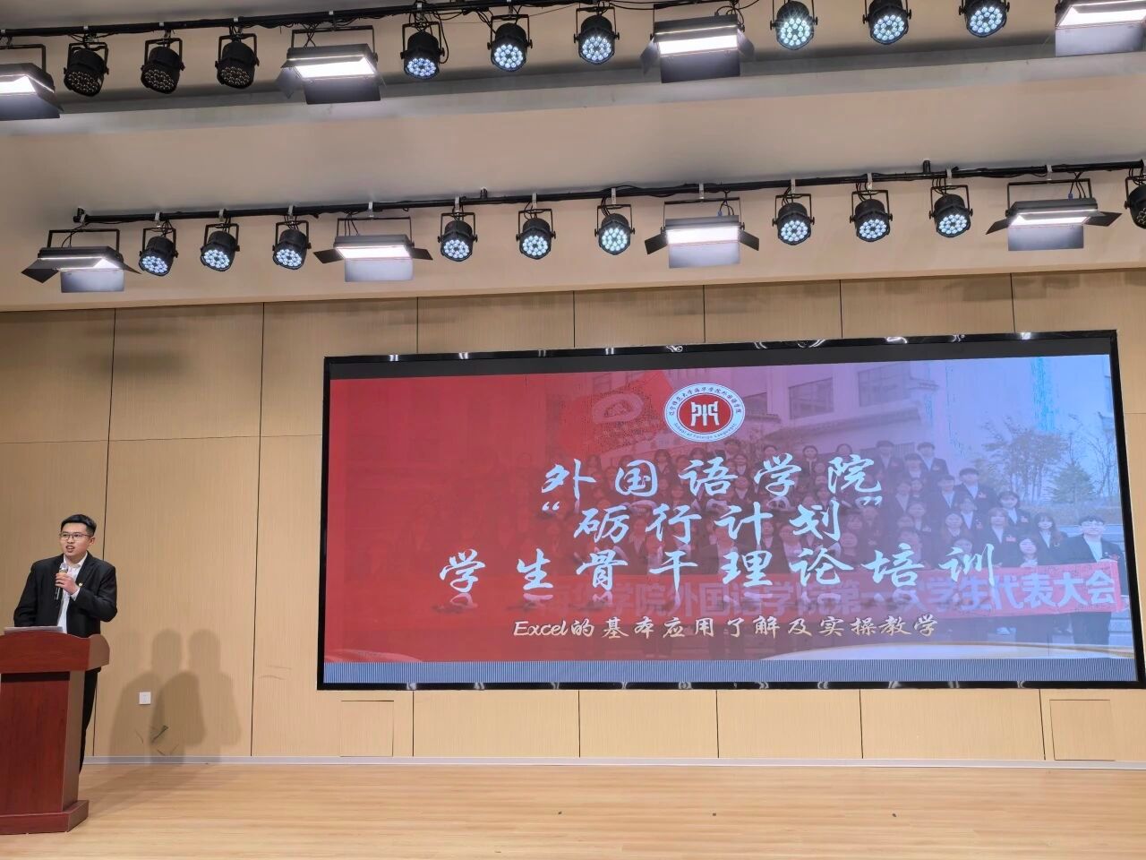 为进一步加强学生干部团体凝聚力,提升学生干部的综合实践能力,外国语学院精心策划并成功开展了“砺行计划”——学生干部理论技能系列培训“1+1+1+N”模式的第三讲于2025年4月17日在辽宁师范大学海华学院东校区1号楼报告厅圆满举行,本次培训特别邀请了校团委兼职副书记(学生)郑光宇同学担任主讲嘉宾,他凭借丰富的经验和深厚的专业知识,为我院学子带来了一场关于办公软件Excel的深度培训,有效提升了学生干部的综合素质能力。