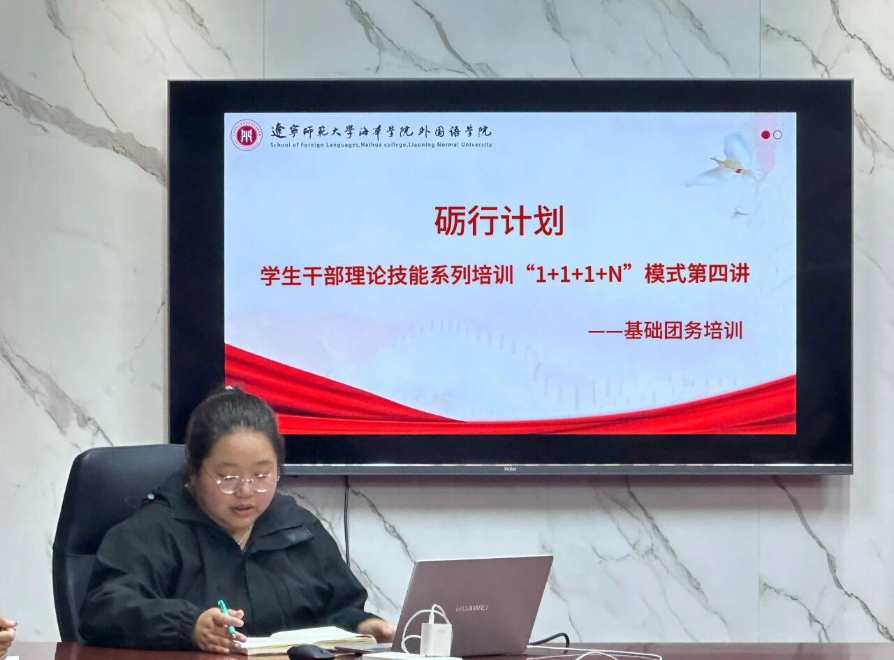 为扎实推进基础团务日常工作,全面提升学院组织工作效率与内部协作水平,保障各项工作高效、有序开展,外国语学院组织部精心策划并举办“砺行计划”——学生干部理论技能系列培训“1+1+1+N”模式第四讲。在辽宁师范大学海华学院西校区党员之家圆满举行,此次培训由外国语学院辅导员梁策主讲。