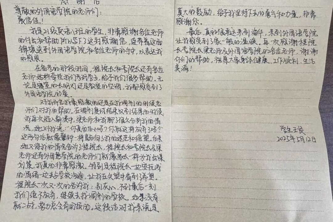 在调剂的关键阶段,王贤得到了学院领导和老师们的全力相助。程迎新院长说“不到最后一刻我们绝不放弃”,她结合王贤的情况深入分析招生政策,为她推荐适配院校;学生辅导员梁策老师全程跟进进度,在学生迷茫时给予帮助,并在学生崩溃时反复激励“你真的甘心吗?你就这样放弃了吗?”一次次唤醒了王贤;李成宇副院长多次给出建议,始终给予温暖的精神鼓励与悉心开导。外国语的老师们,以家长般的关怀为其谋划出路,最终助其重拾信心,在困境中看到希望。在学院的全方位支持下,王贤及时调整心态,应对调剂环节。成功上岸后,王贤亲笔写下感谢信送予老师,表达对学院领导和老师衷心的感谢。