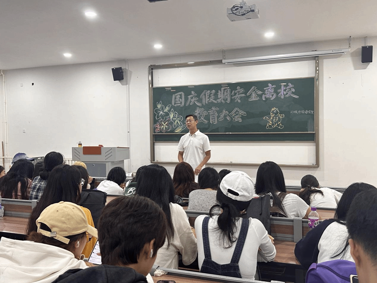 随着金秋十月的脚步悄然而至,我们即将迎来举国同庆的国庆长假!在这举国欢腾的时刻,安全出行、健康度假尤为重要。外国语学院分别于东、西校区陆续召开国庆假期安全教育主题班会。各年级辅导员老师主讲,学院全体学生参与会议。