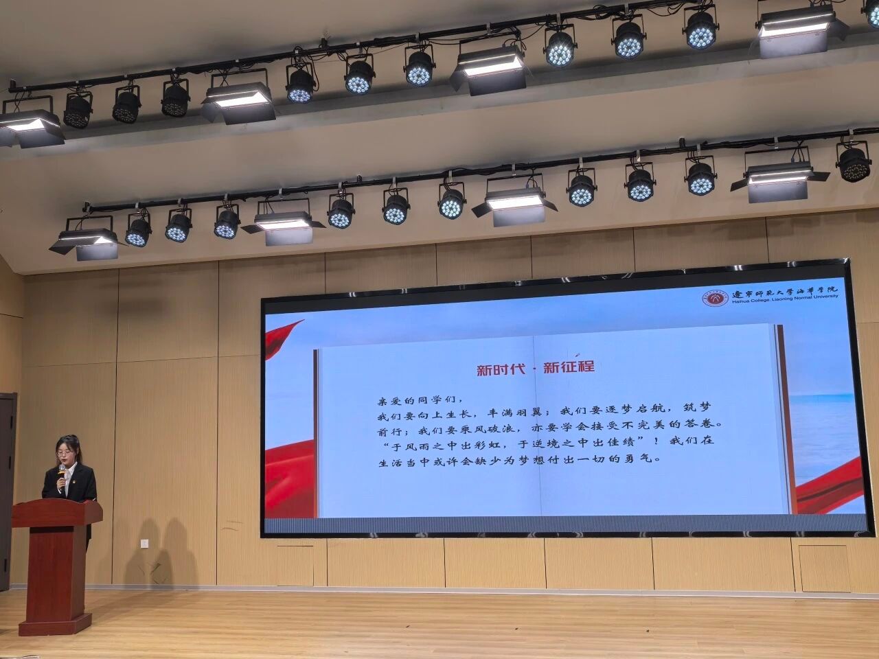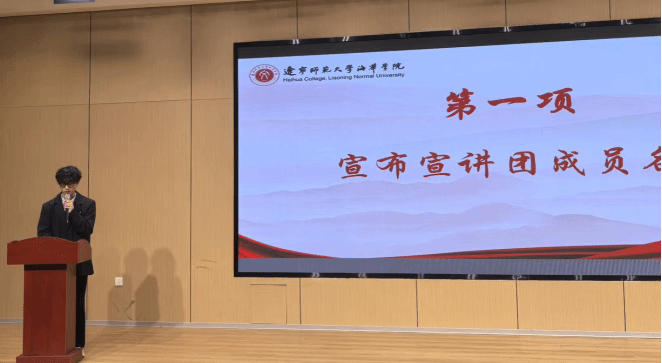大会第二项议程,大会主持人李柯郑重宣布宣讲团成员名单。学院通过高标准、严要求的层层筛选,综合考量个人思想政治表现、语言表达能力、专业素养及现场演讲实力,决定聘任李柯、白静、董芷含等10名同学为砺行传音宣讲团成员。