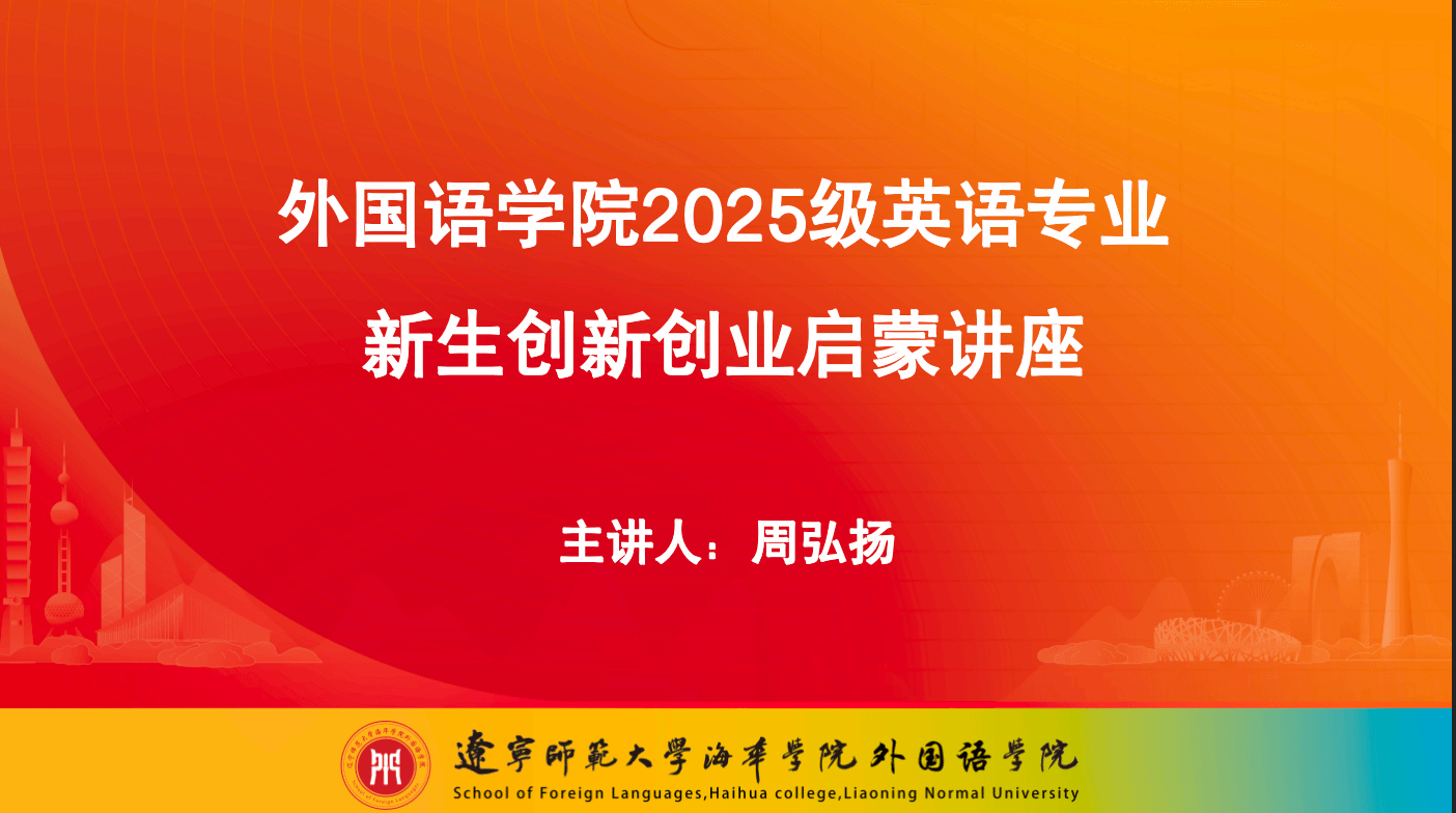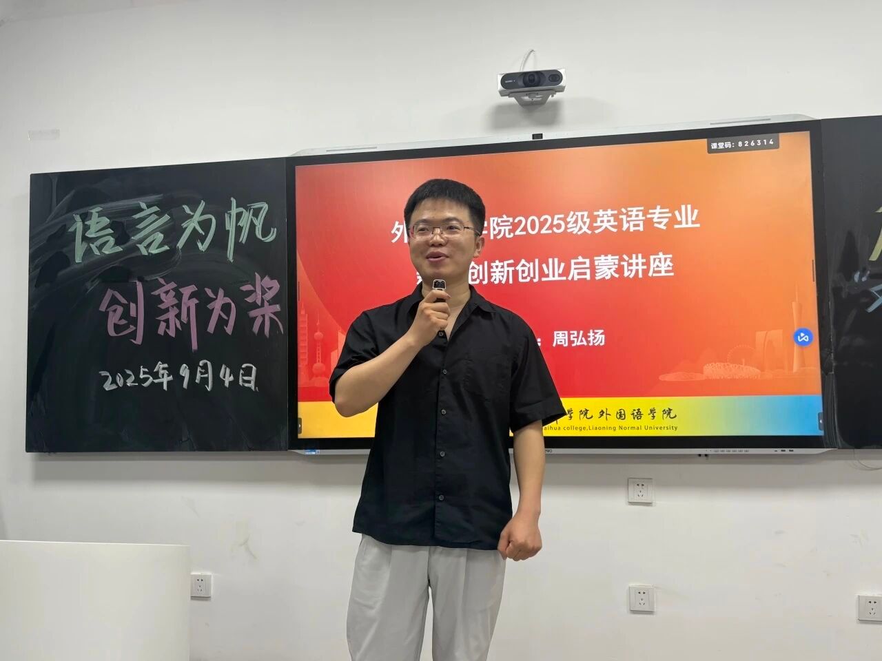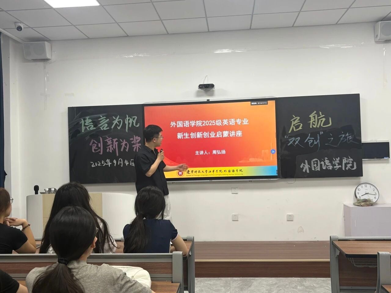 为深入贯彻落实国家关于创新创业人才培养的决策部署,激发新生创新思维,近日,外国语学院在东校区为2025级英语专业新生举办创新创业启蒙讲座。讲座以“语言为帆,创新为桨”为主题,旨在激发新生创新思维、培育创业精神,展现“英语+”复合发展可能,落实国家创新创业人才培养部署。