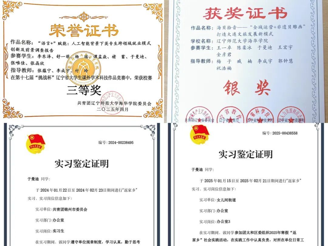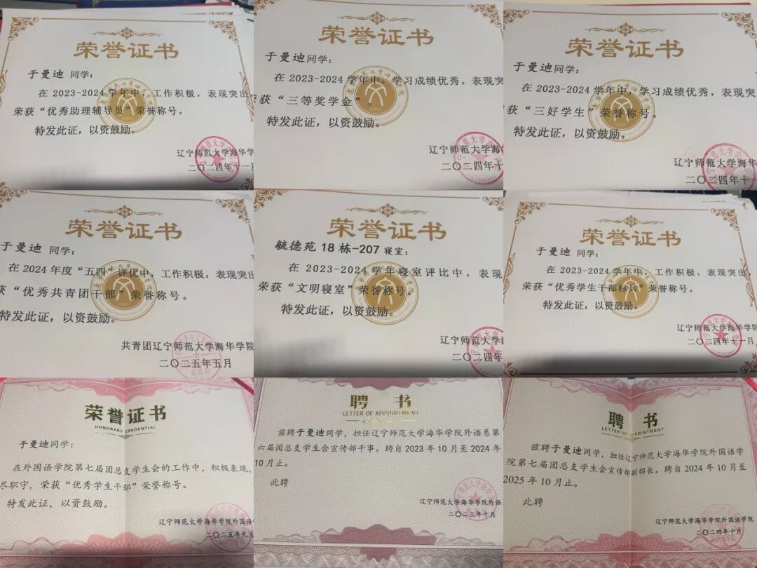 于曼迪,女,外国语学院英语专业2023级学生,现任外国语学院学生会执行主席。从宣传部干事到副部长,再到英语2401班助理辅导员,她在不同岗位上不断解锁新技能、突破新可能。凭借这份敢闯敢拼的劲头,她先后将“优秀共青团干部”“优秀学生干部标兵”“三好学生”“优秀助理辅导员‘”“文明寝室”等10余项荣誉收入囊中。在科创赛道上,她同样闪闪发光——2024年“挑战杯”辽宁省大学生创业计划竞赛省级银奖、第十七届“挑战杯”辽宁省大学生课外学术科技作品竞赛校赛三等奖,每一份成绩都见证着她的坚持与实力。