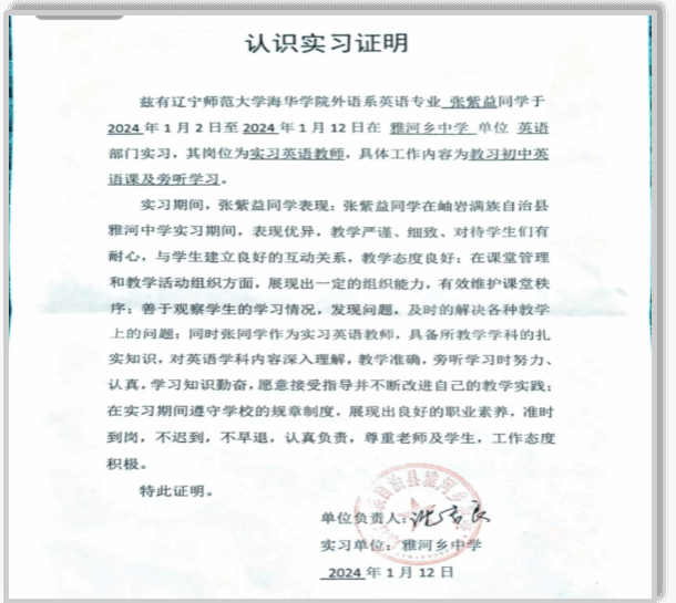 怀揣一颗为党育人的教师梦想,她于2024年1月在雅河中学,担任一名英语实习教师,同时她在寒暑假期间应聘到线上和线下的教育机构,累计教学100余名学生,用专业所学,追逐榜样张桂梅的力量筑梦家乡逐梦海华。
