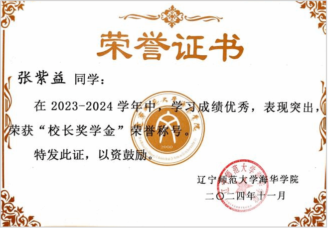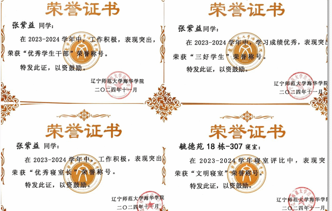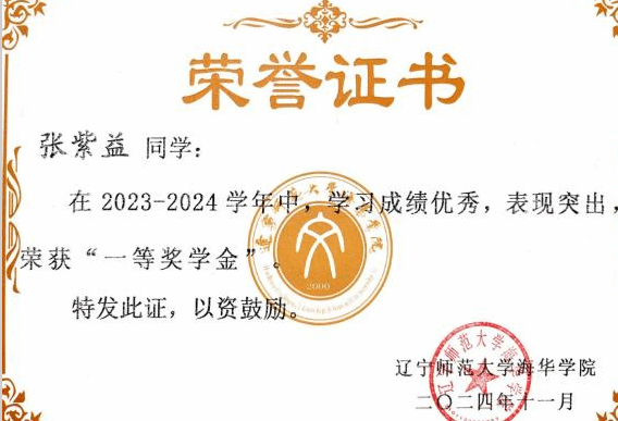 在学习方面,大一学年,张紫益同学取得了专业学习和综合测评“双第一”的优异成绩,并连续两年位列年级前五名,凭借优异的成绩获得国家奖学金和校长奖学金。但她并没有因此而骄傲自满,而是更加努力地学习,追求更高的目标。课后,她参与许多专业竞赛,获得辽宁省高校师范生教学创新大赛省级三等奖、第五届辽宁省翻译大赛省级优秀奖、外研社国才杯校级铜奖、第一届未来教师教学大赛校级三等奖等。日日勤耕不辍,终赢智慧丰收!
