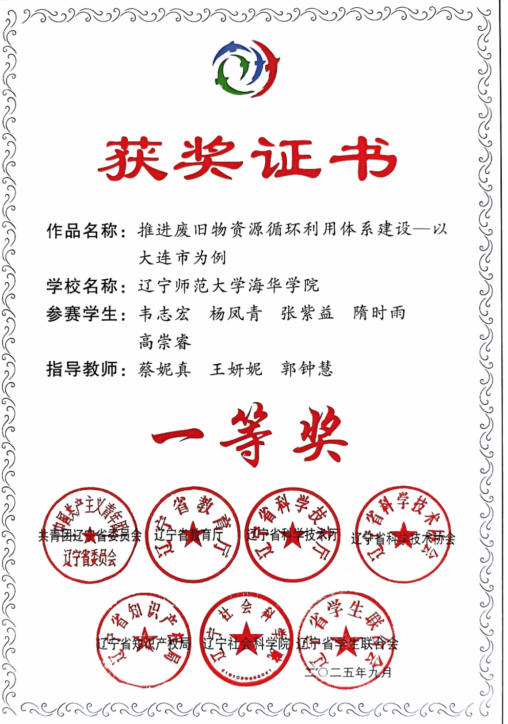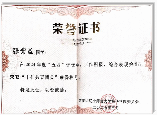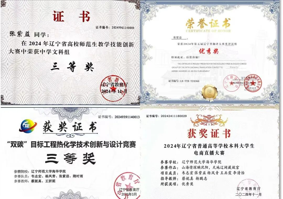 张紫益同学的青春画卷多姿多彩,“学习、实践、竞创”并举齐抓。在竞赛方面,她获得2025年大学生创新创业训练计划项目国家级立项、第十七届“挑战杯”辽宁省大学生课外学术科技作品竞赛省级一等奖、辽宁省高校师范生教学创新大赛省级三等奖、第五届辽宁省翻译大赛省级优秀奖、“建行杯”辽宁省大学生创新大赛总决赛暨中国国际大学生创新大赛省级铜奖、“双碳”目标工程热化学技术创新与竞赛省级三等奖、辽宁省普通高等学校本科大学生电视直播大赛省级优秀奖等荣誉。