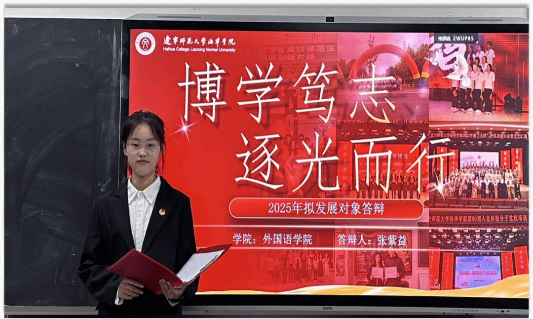自2019年成为一名光荣的共青团员以来,张紫益同学便时刻以一名优秀共产党员的标准严格要求自己。2023年,刚刚步入海华的她便向党组织递交了入党申请书。经过2024年9月团推优和党校培训考核,她成为第80期入党积极分子。2025年9月经过团推优以及层层考核,她最终被确定为第55期发展对象。此后,她更加严格要求自己,努力向党组织靠拢,争取早日成为一名光荣的共产党员。红心向党,亦有星火之志,党旗飘飘,助梦成长!