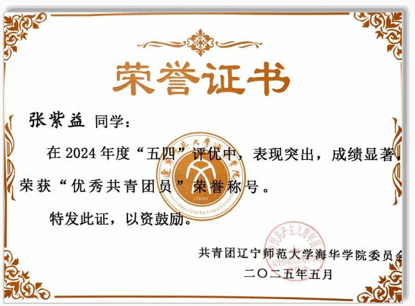 张紫益,女,2004年12月出生,第55期发展对象,现任外国语学院文体部部长,外国语学院宣讲团干事和寝室长,曾任就业助理团干事、“学海风华”学风建设宣讲团副社长等职务。在过去两年中,她累计获得国家奖学金、校长奖学金、校长奖章、十佳共青团员、校一等奖学金、优秀学生干部标兵、三好学生、优秀共青团员等30余项奖项。她曾获2025年大学生创新创业训练计划项目国家级立项;第十七届“挑战杯”辽宁省大学生课外学术科技作品竞赛省级一等奖;“建行杯”辽宁省大学生创新大赛总决赛暨中国国际大学生创新大赛省级铜奖;2024年辽宁省高校师范生教学创新大赛省级三等奖等国家级立项1项,省级奖项6项,院校级奖项20余项。