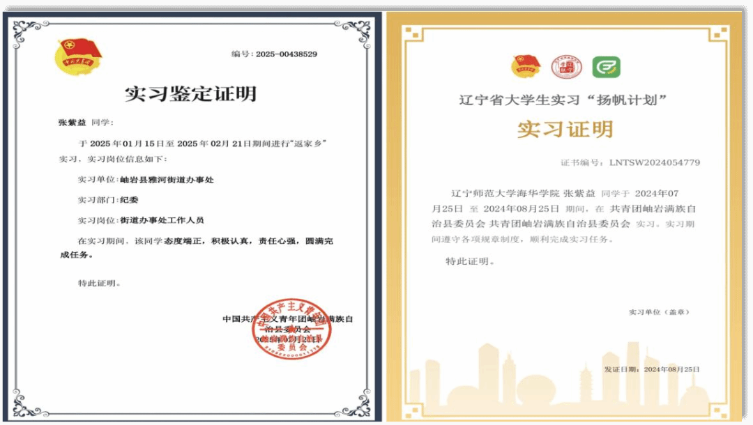 她两次参加返家乡社会实践活动——扬帆计划,参加岫岩满族自治县爱民拥警志愿者协会的活动,团县委小手拉大手共建文明城、消防救援大队演练活动等。在乡镇政府纪委担任工作人员,情牵桑梓,用青年之热心,助社会一臂力!