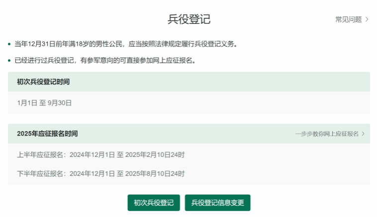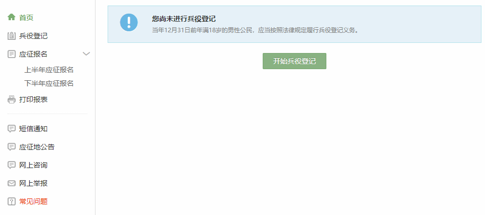在该页面会告知报名时间以及参军政策说明,建议有意参加征兵的同学阅读过后再点击“初次兵役登记”。