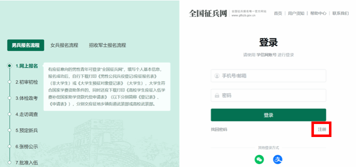 2.重复注册问题处理:报名中若提示身份证号、手机号或邮箱已注册时,应优先通过系统找回原有账号,勿重复注册;无法自行找回可联系应征地兵役机关或学信网客服。