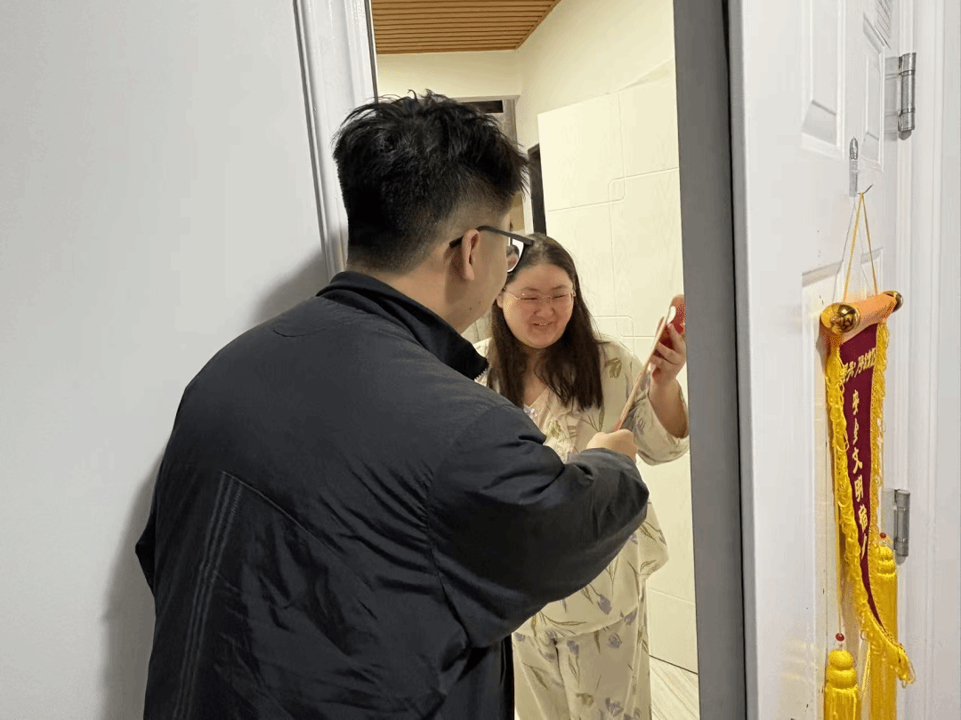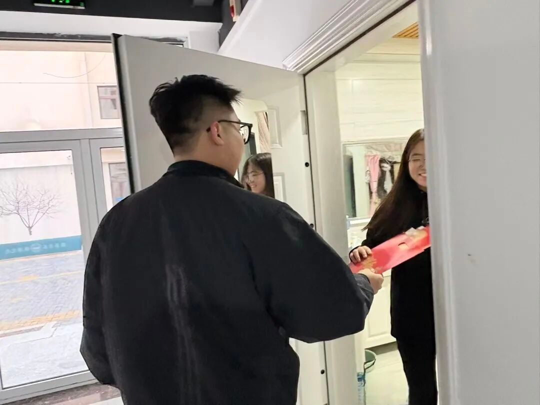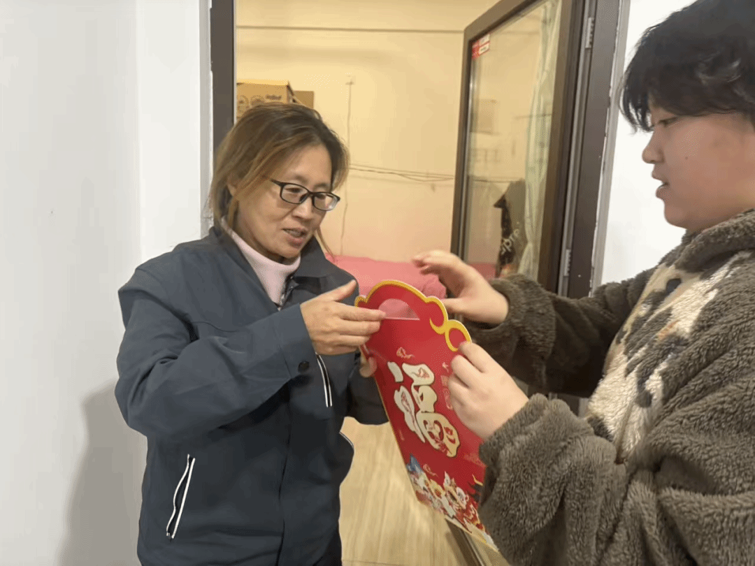 辅导员手提装满春联的福袋,为同学们送上温暖。这些春联红底烫金,既有“迎新春事事如意,接鸿福步步高升”的美好祈愿,也有“富贵平安福满堂,人和家顺万事兴”的温馨祝福,每一句都藏着学院对学子的牵挂。