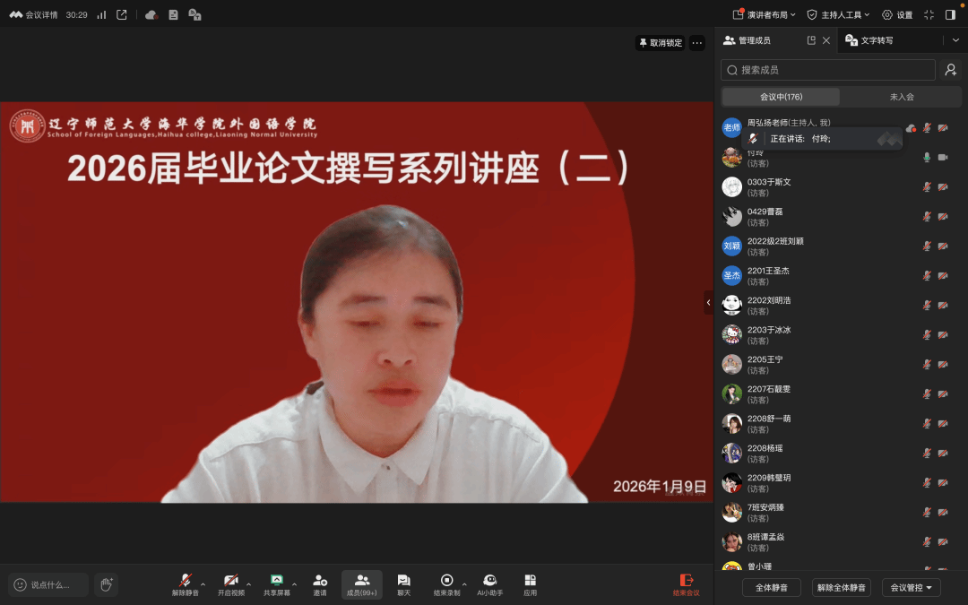 李梓悦月主任对论文格式的规范性和中期报告的撰写进行了详细讲解。她强调,同学们要提前熟悉我院结合学校要求制定的论文格式要求,注意区分直接引用和间接引用,确保参考文献列表与正文引用一致。李梓悦月主任还展示了中期检查报告的模板,详细讲解了填写要求、提交流程及近期撰写任务要点。