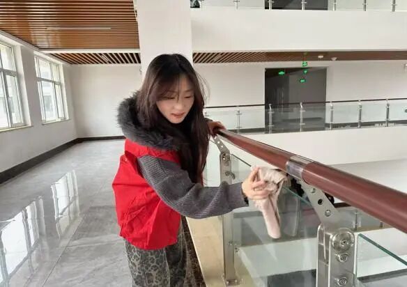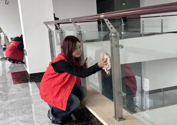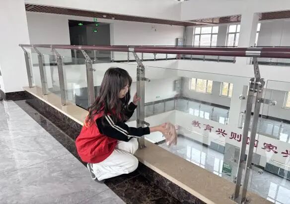 弯腰、抬手、清洗、擦拭、晾干,一连串动作连贯又专注。汗水浸湿衣袖,却丝毫未减大家的服务热情。在志愿者们的齐心协作下,原本蒙尘的玻璃重焕洁净透亮,教学楼走廊窗明几净,校园环境也因这抹志愿红变得更加明亮整洁。