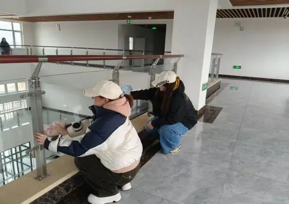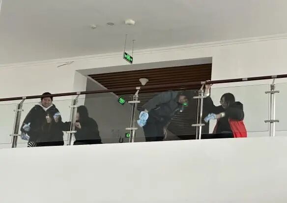 志愿服务现场,外院志愿者们精神饱满、分工明确,手持抹布、水桶等清洁工具,有序前往教学楼各楼层走廊开展玻璃清洁工作。擦拭窗面、清除边角积尘,每一个动作都细致认真、一丝不苟,充分让吃苦耐劳、团结协作、乐于奉献的优良作风,在青春的身影中展现得淋漓尽致。