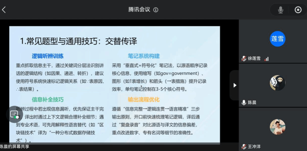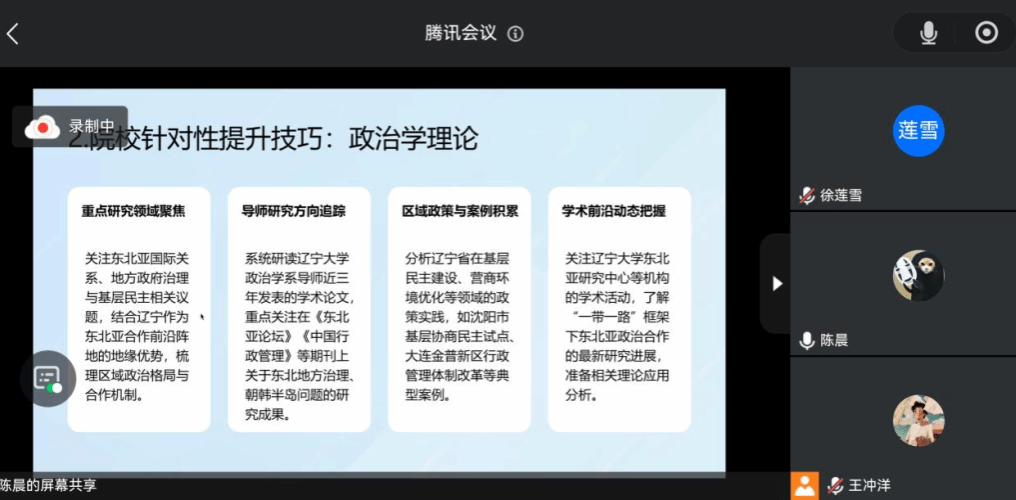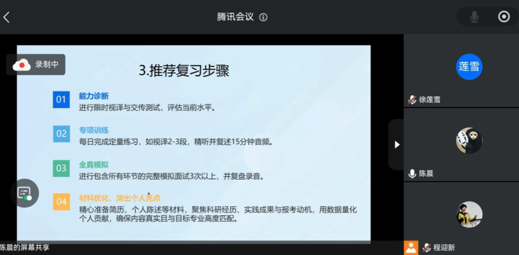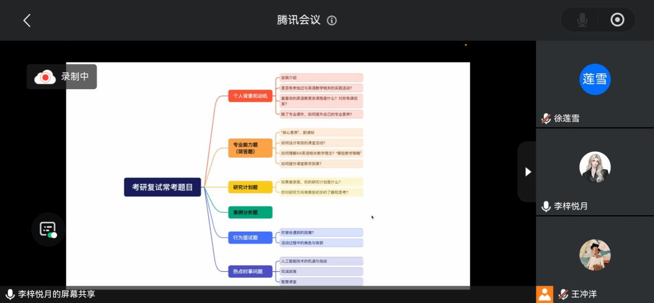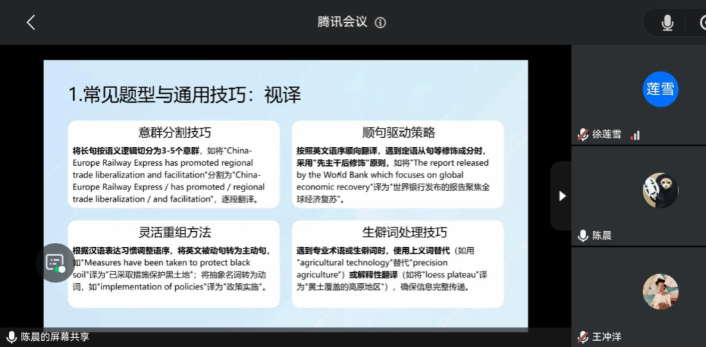随后,陈晨老师率先发言。她结合多年辅导经验,从翻译理论问答的通用技巧、不同院校类型的面试准备策略、会计专硕与交叉学科的面试要点,以及面试准备的步骤与材料整理等方面进行了系统讲解。陈晨老师建议大家要把理论定义精准化,案例分析场景化,并针对财经、人文、师范、理工等院校特点给出了具体建议。她还详细介绍了会计专硕的专业概念解读、会计分录编制、模拟面试复盘等技巧,以及交叉学科中如何结合数据分析与语言学问题。最后,她总结了面试准备的完整步骤,包括制定备考计划、组织模拟面试和材料整理,帮助同学们全面提升复试竞争力。