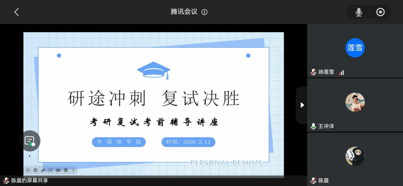 为进一步加强考研上线学生的复试指导工作,帮助大家更好地备战复试,3月11日,外国语学院特别邀请了陈晨老师和李梓悦月老师为考研上线学子举办了一场考前辅导讲座。讲座由外国语学院学生工作副院长王冲洋主持,现场气氛热烈,吸引了40多名考研上线学子参与。