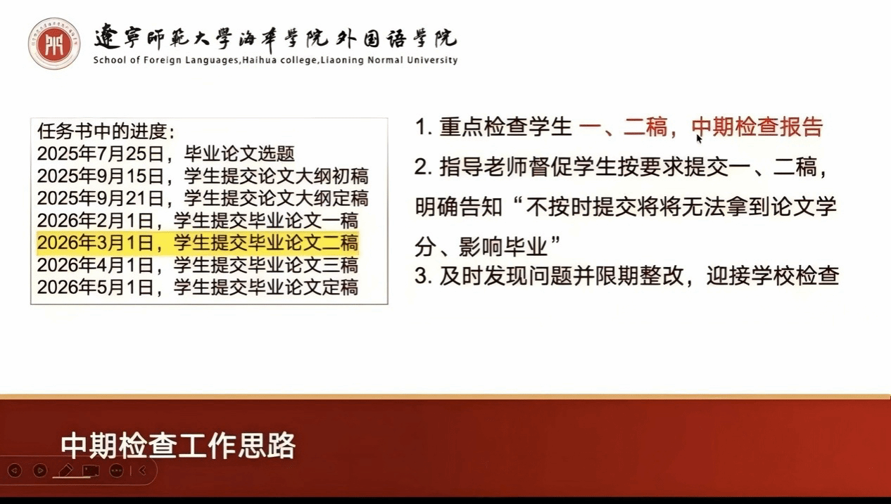 为稳步推进2026届就业、毕业论文、考研等核心工作,切实落实毕业生各项关键任务。3月18日,外国语学院召开2026届毕业生重点工作线上推进会议。会议由张蕴宁院长主持,对毕业论文中期检查、高质量就业推进、考研复试准备等工作进行统筹部署。