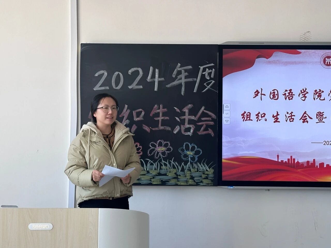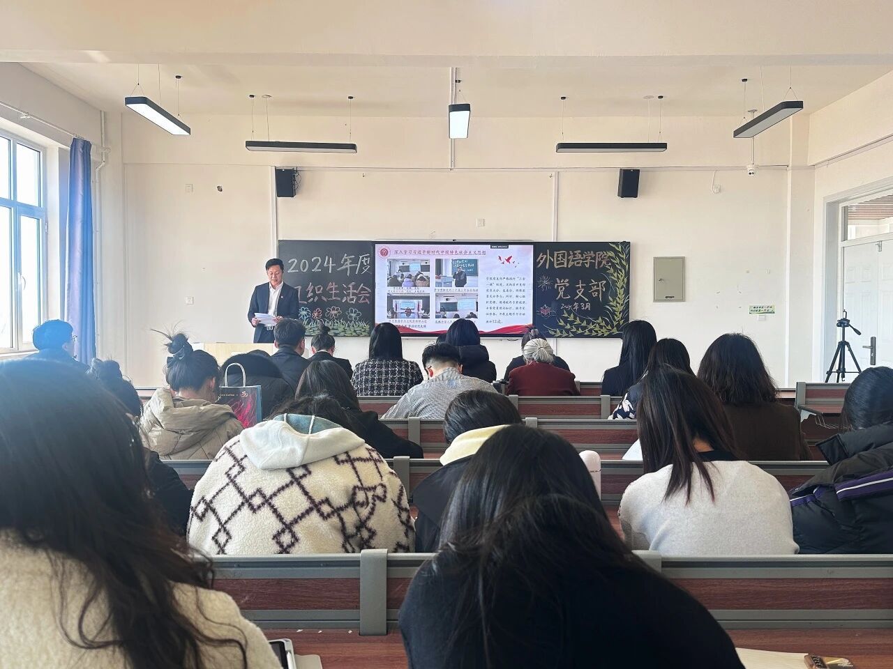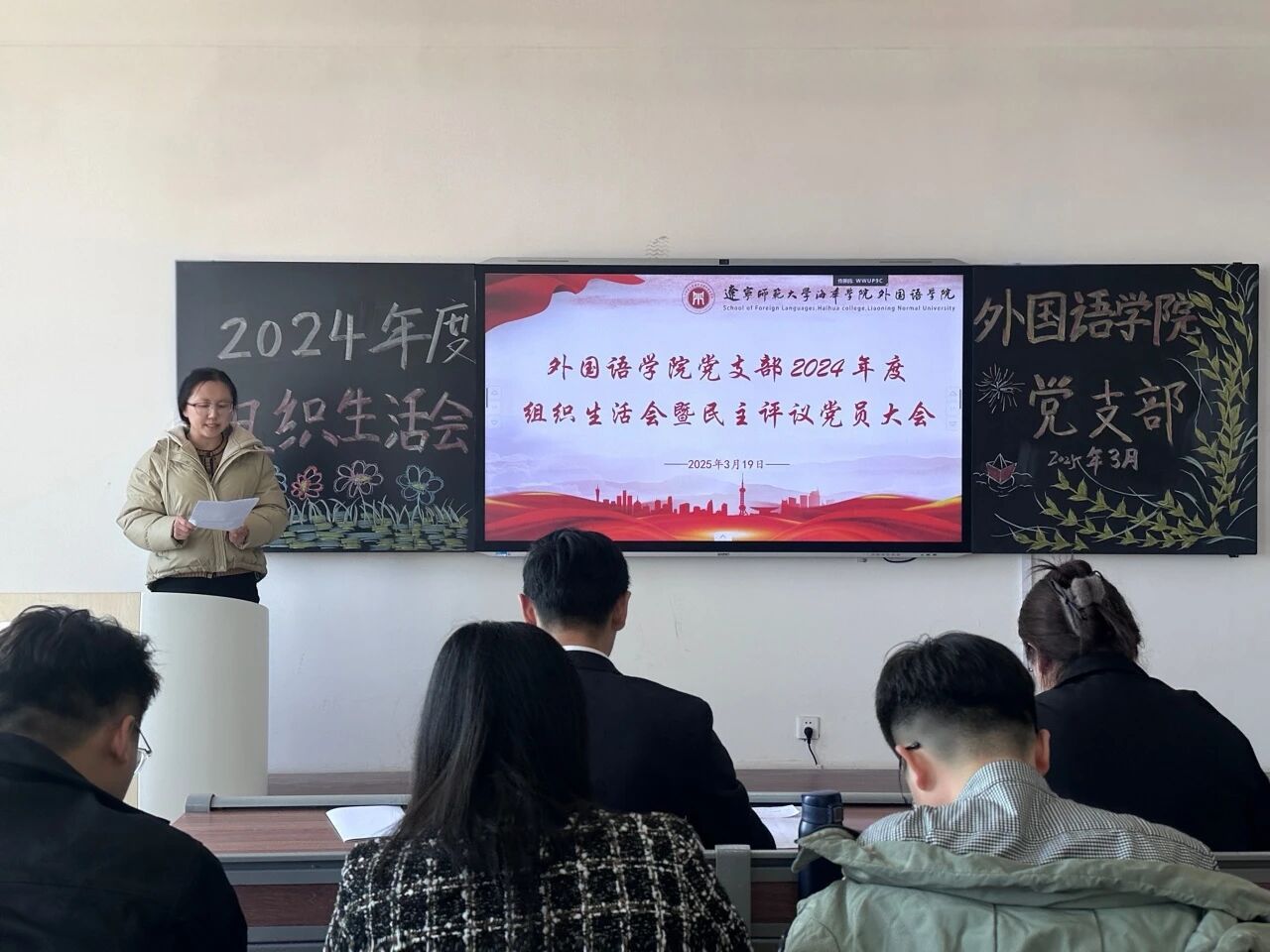 为深入学习贯彻习近平新时代中国特色社会主义思想,巩固深化党纪学习教育成果,综合发挥党的纪律教育和约束作用、保障激励作用,进一步加强党组织的凝聚力和战斗力,2025年3月19日外国语学院党支部成功召开2024年度组织生活会暨民主评议党员大会。会议由外国语学院党支部书记李成宇主持,学校党委督导组成员、组织部负责人武月丹莅临指导,外国语学院党支部全体党员参加。