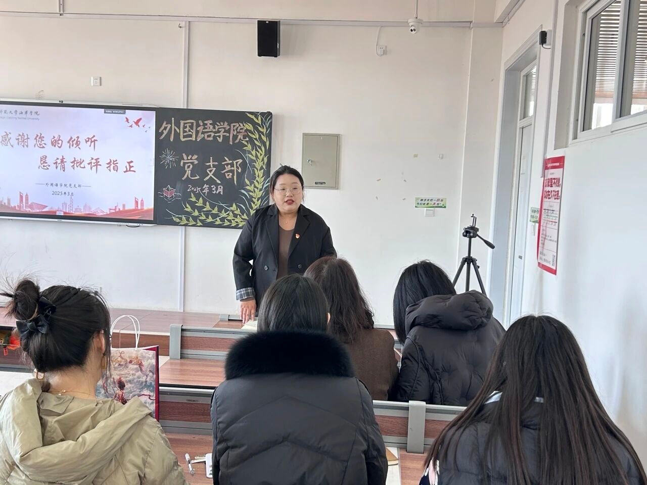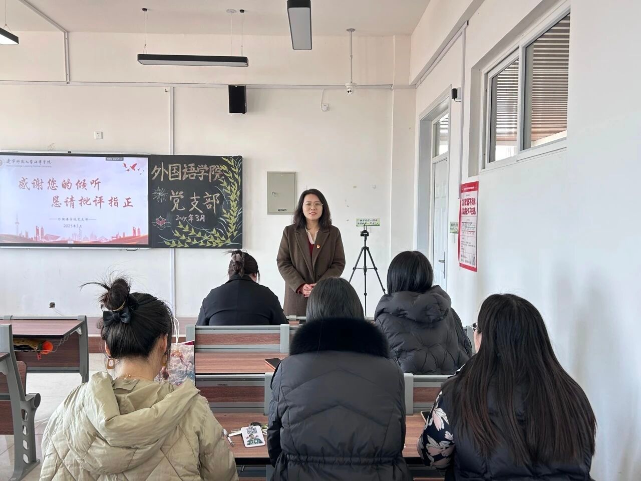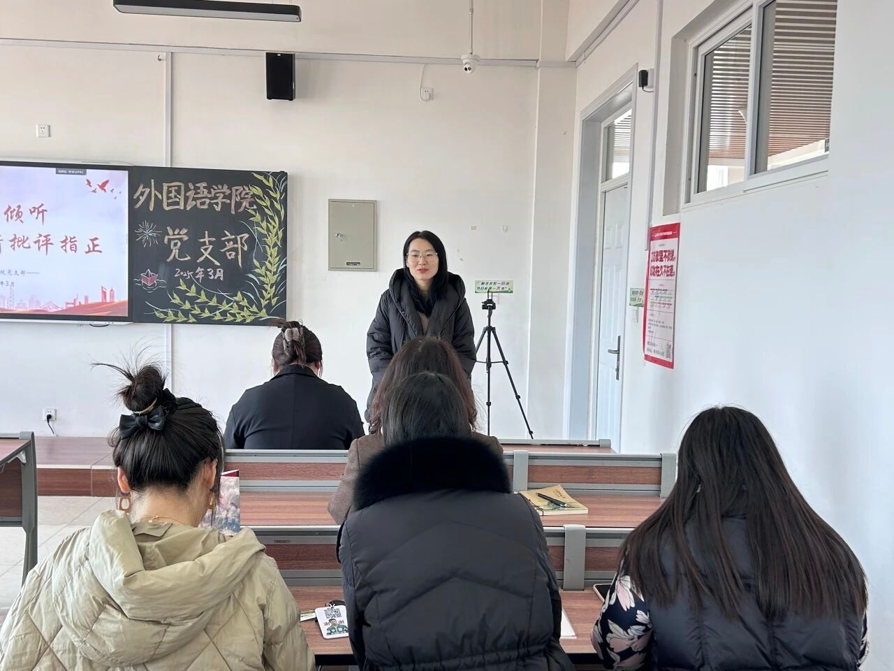 为深入学习贯彻习近平新时代中国特色社会主义思想,巩固深化党纪学习教育成果,综合发挥党的纪律教育和约束作用、保障激励作用,进一步加强党组织的凝聚力和战斗力,2025年3月19日外国语学院党支部成功召开2024年度组织生活会暨民主评议党员大会。会议由外国语学院党支部书记李成宇主持,学校党委督导组成员、组织部负责人武月丹莅临指导,外国语学院党支部全体党员参加。