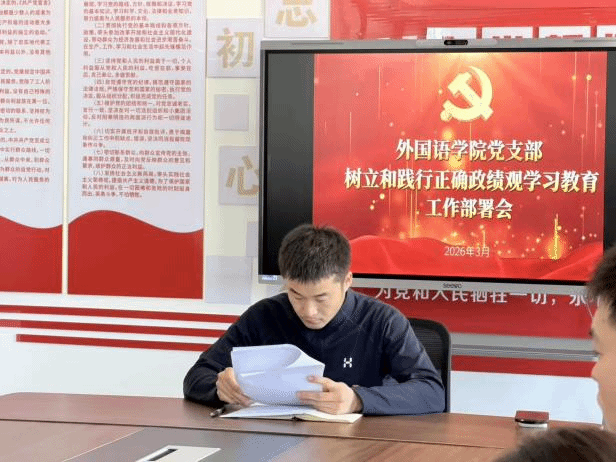 为深入学习贯彻习近平总书记关于树立和践行正确政绩观的重要论述,严格落实学校党委各项工作部署与文件要求,持续夯实基层党建根基,切实筑牢全院师生党员思想理论防线。3月18日,外国语学院党支部组织召开树立和践行正确政绩观学习教育专项工作部署会,正式全面启动本院正确政绩观学习教育系列工作。