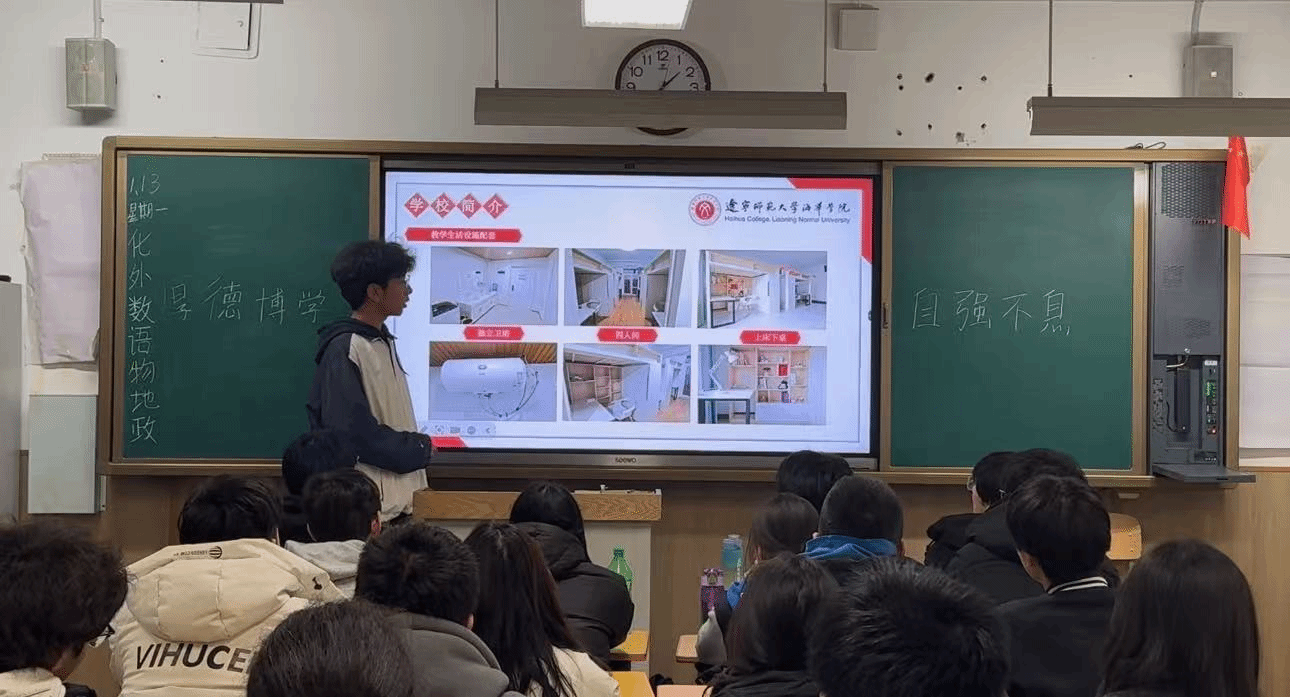 以杨双睿同学为代表的回访团队回到母校沈阳市第八十八中学,为学弟学妹们带来了一场温暖而有意义的宣讲。宣讲会上,他通过展示精美的宣传手册,图文并茂地为大家介绍学院环境,窗明几净的计算机房、藏书丰富的图书馆,还有配备智能教学系统的多媒体教室。通过实景照片和数据展示,让同学们充分感受海华学院现代化的教学条件和浓厚的学术氛围。