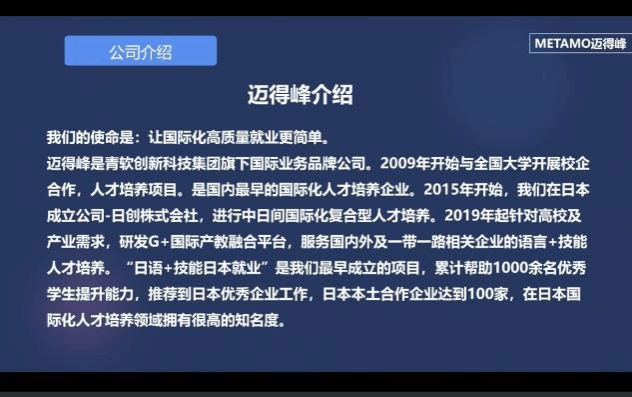 为深化校企合作,助力日语专业学子职业发展,4月8日,外国语学院特别邀请迈得峰智能科技(青岛)有限公司渠道总监滕大伟先生,面向21级日语专业毕业生开展线上就业赋能宣讲。这场专为外语学子设计的职业对话,不仅打破了语言与技术壁垒,更搭建起直通日企高薪岗位的“快车道”。