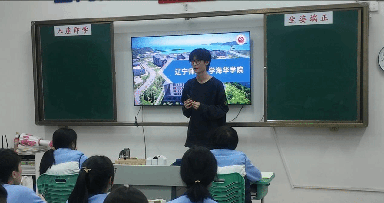 宣讲尾声,谢序翔同学向高中母校领导与老师的支持表达诚挚谢意,同时鼓励学弟学妹珍惜时光、全力以赴,并热情发出邀请:“期待在辽宁师范大学海华学院与大家相遇,共同开启精彩充实的大学新篇章!”