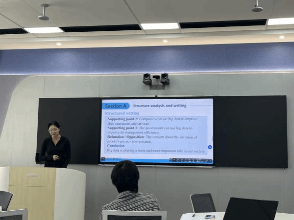 最后,殷小涵老师以一堂写作课为例,利用最新四级真题进行讲解,逐步引导学生写好一篇议论文。王宇飞老师对殷老师的说课进行了点评:殷老师的教学设计由浅入深,层层递进。首先考虑到学生的实际情况,先讲解词汇,再进行翻译,又讲如何去议论,最后进行议论文写作,教学方法新颖,教学效果突出。