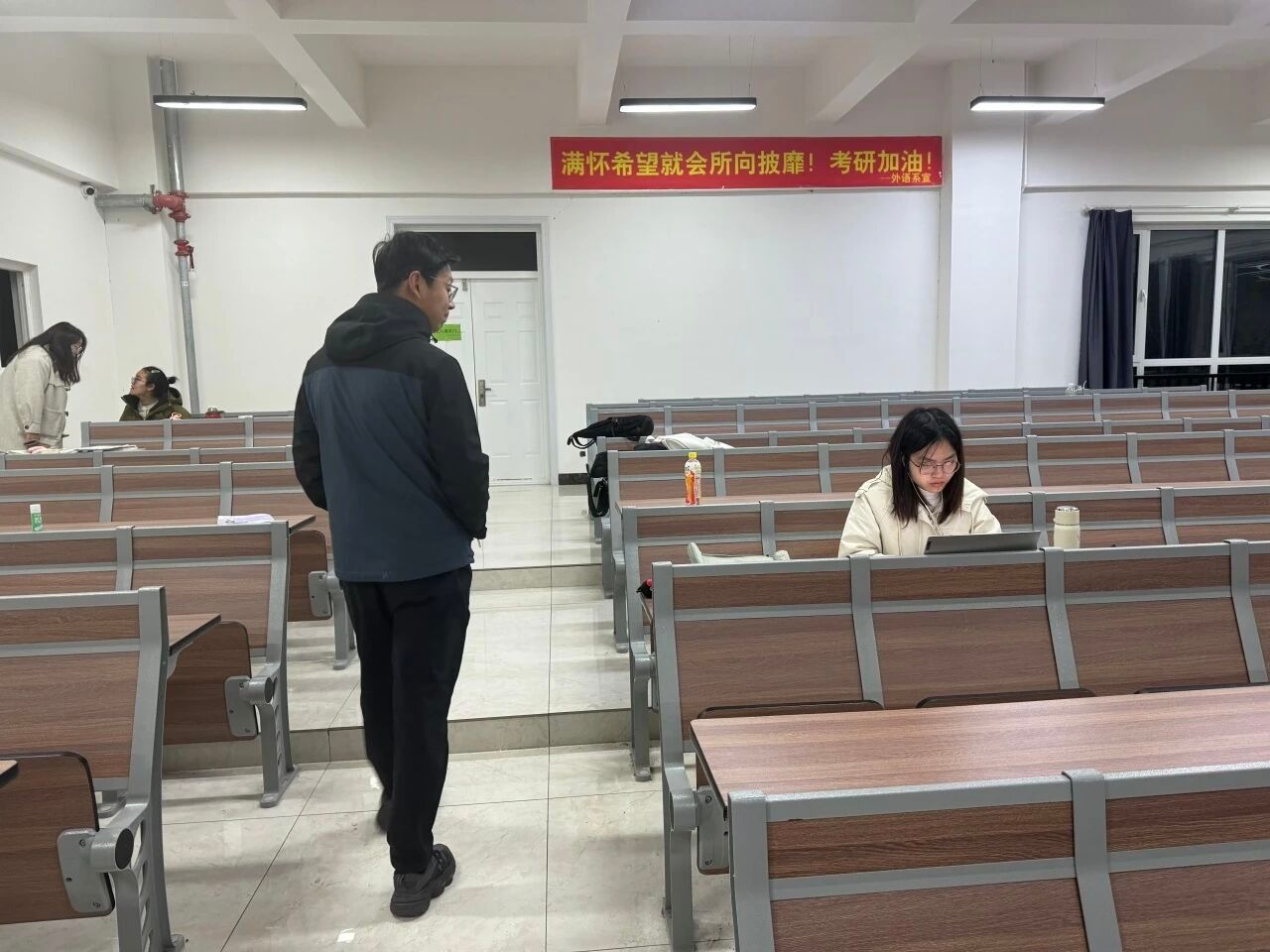 为深入了解考研学子的备考情况,进一步助力考研学子坚定目标、缓解压力、增强信心,同时推进留校备考学生的安全管理与服务保障工作,外国语学院于11月18日开展了一场温馨的走访慰问活动。外国语学院学生工作副院长李成宇与辅导员梁策亲自走访了考研自习室、考研寝室及图书馆等地,将学院的深切关怀与殷切期望传递给每一位在考研征途中奋力拼搏的学子。